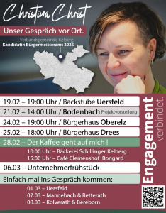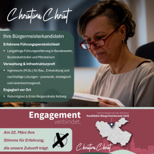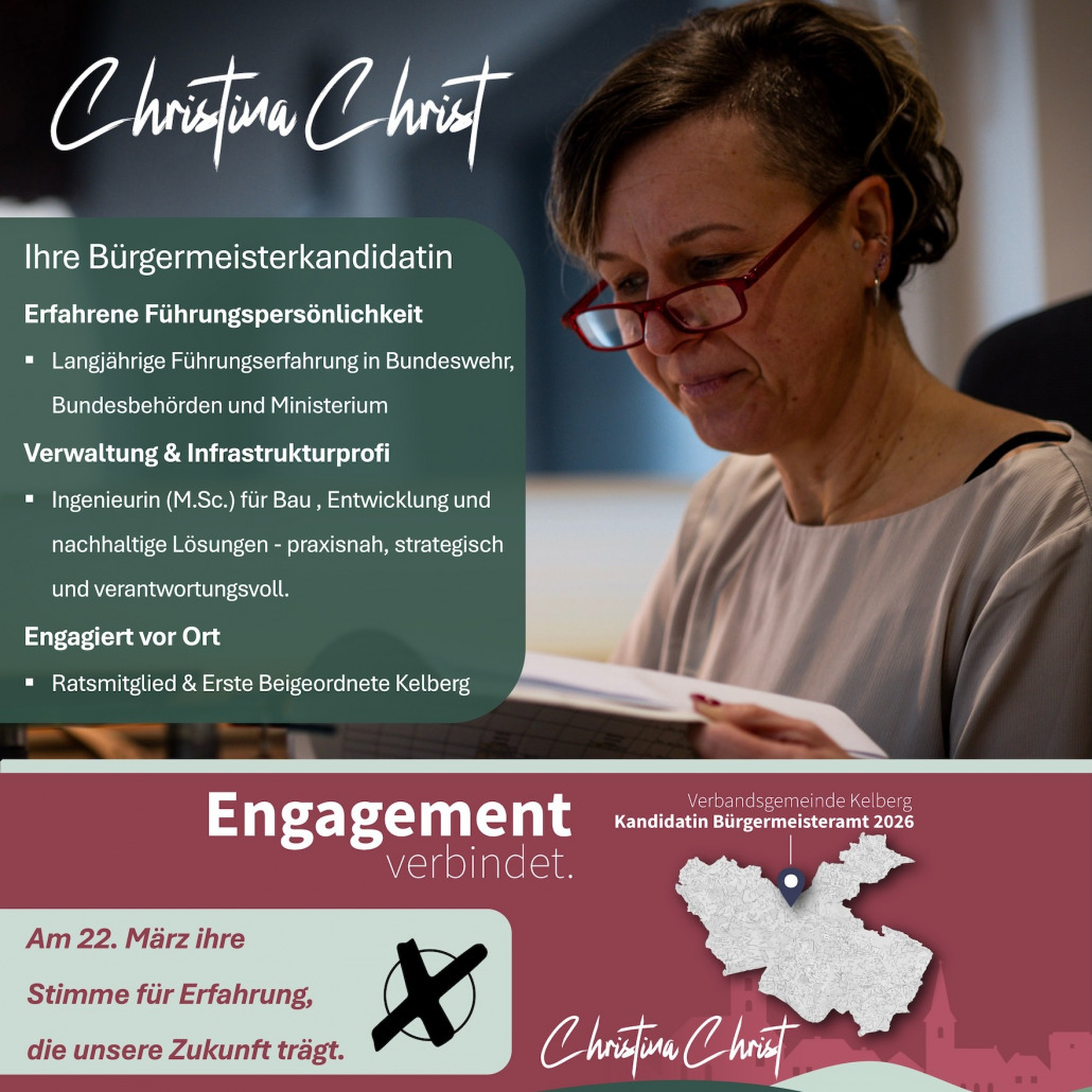mein Name ist Christina Christ, Ich bin 48 Jahre alt, verheiratet und lebe mit meiner Familie in Kelberg. Seit vielen Jahren engagiere ich mich ehrenamtlich in unserer Verbandsgemeinde – als Mitglied im Werksausschuss, als Ratsmitglied und als 1. Beigeordnete der Ortsgemeinde Kelberg. Dieses Engagement möchte ich als Verbandsbürgermeisterin mit Ihnen gemeinsam fortsetzen: nah dran, verlässlich, lösungsorientiert.